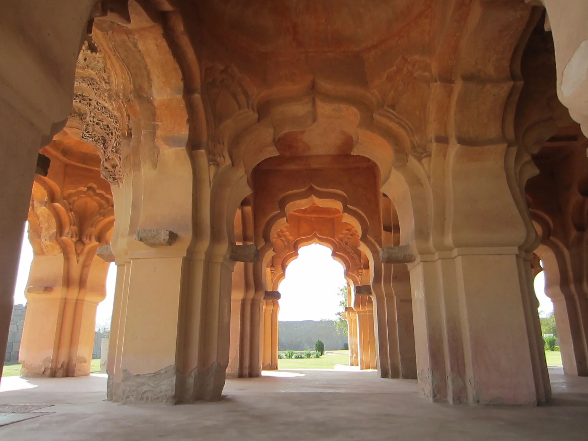 North Indian architecture was also at Hampi and instead of being flat and pyramidal in shape with intricate decoration it is more dome-like and incorporated true arches. The N. Indian architecture is Islamic influenced mostly because N. India was constantly being invaded and controlled by Islamic forces (ie the Mughal Empire). We were able to visit the Queen’s Palace and a particular building called the Lotus Mahal. In the pictures below can you see the N. Indian influences of the carved doorways? It is also mixed with a step/pyramidal roof. This is a great example of Vesara architecture – a mix of both Indian and Islamic styles.